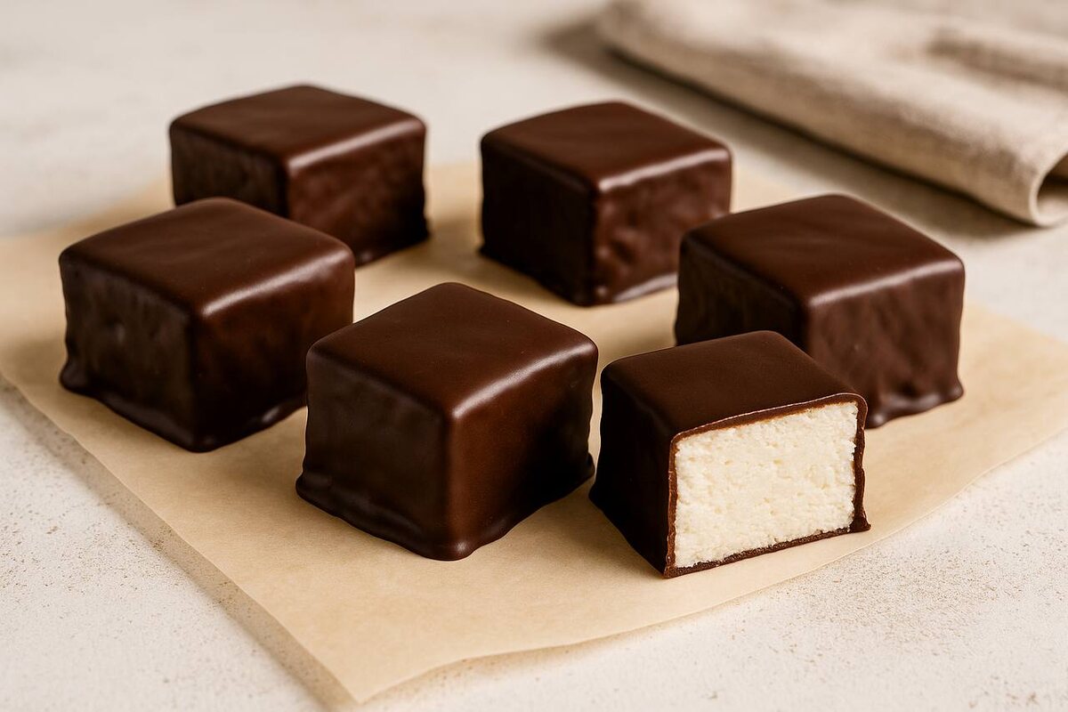 7. Порция: Нарезать застывшее суфле на кусочки, окунуть в глазурь и выложить на решетку для застывания.