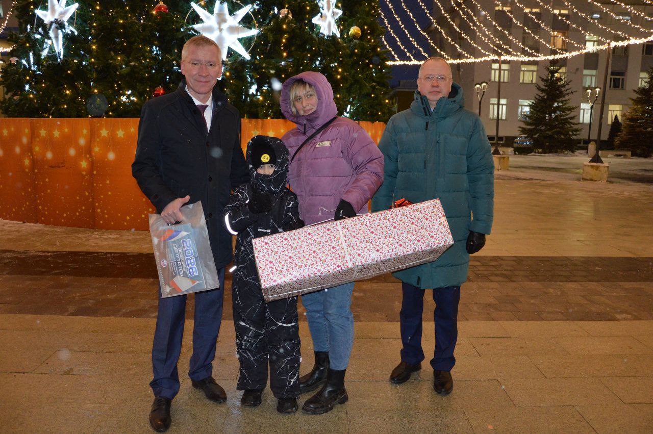 Председатель Избирательной комиссии Вологодской области Денис Зайцев и заместитель председателя Облизбиркома Олег Шляпаков вручили подарок участнику акции "Ёлка желаний", восьмилетнему Артёму из Вологды