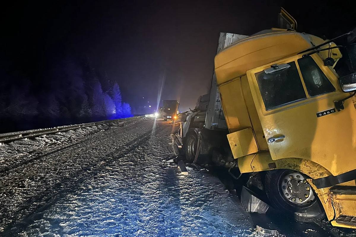 По предварительной информации, 43-летний водитель грузового автомобиля «Рено Магнум» выехал на встречную полосу, где врезался в груженный досками КамАЗ (с полуприцепом) под управлением мужчины 1986 года рождения.