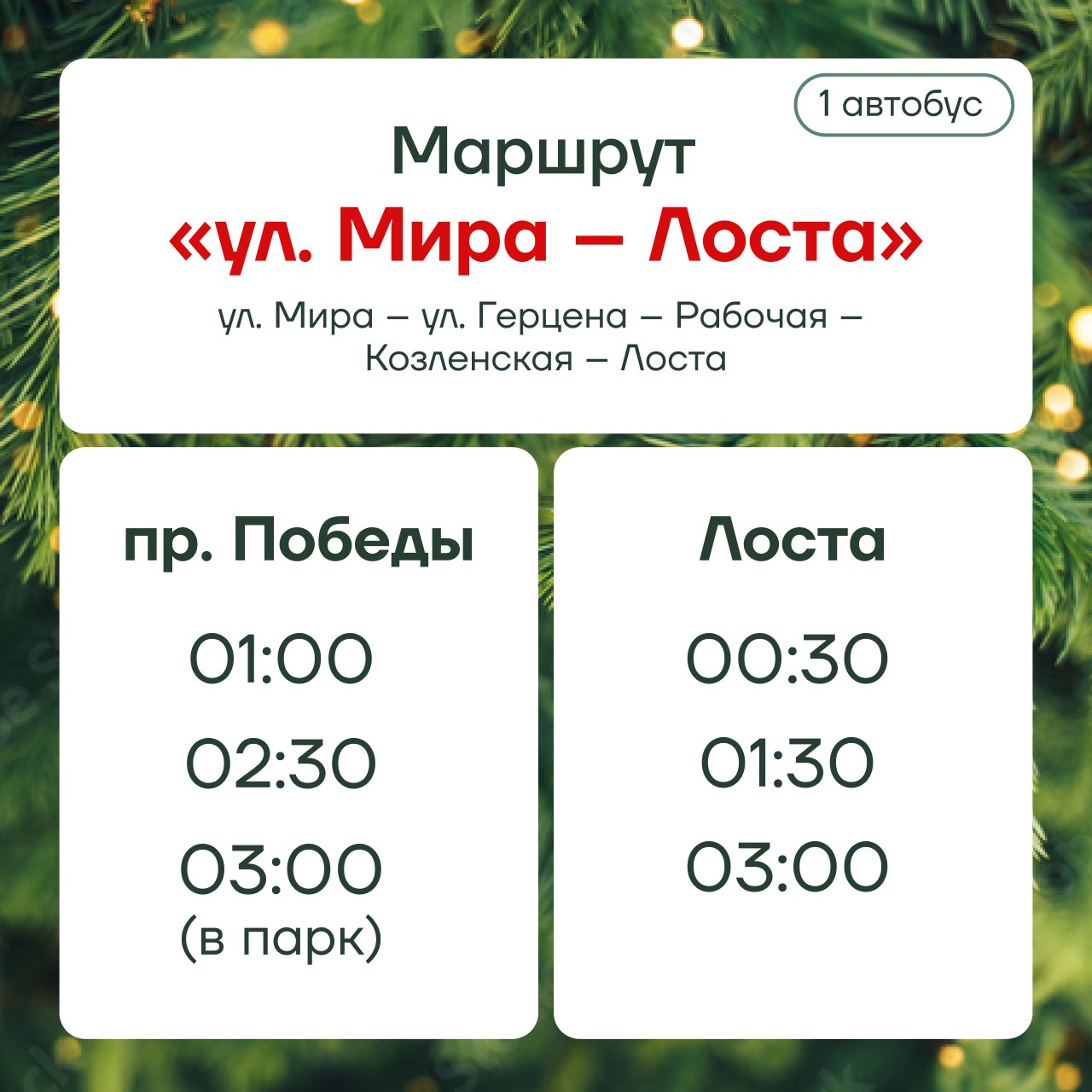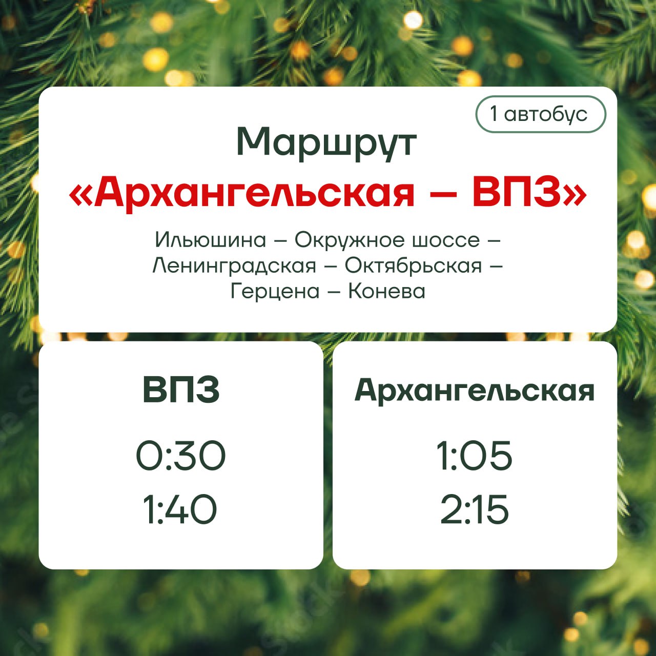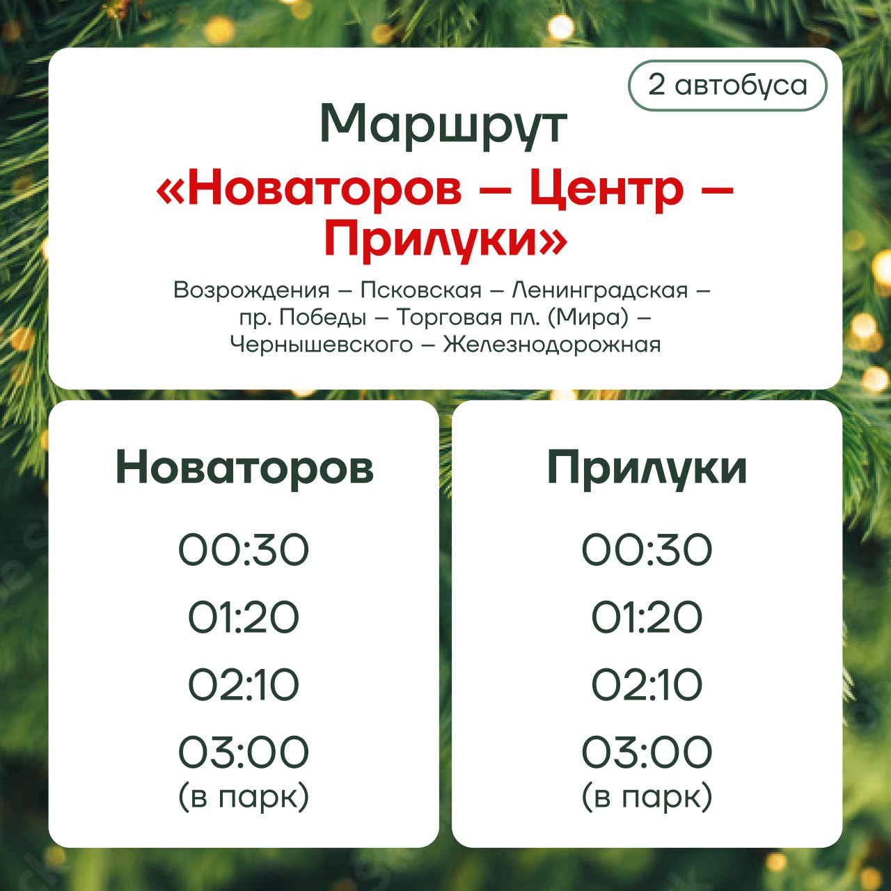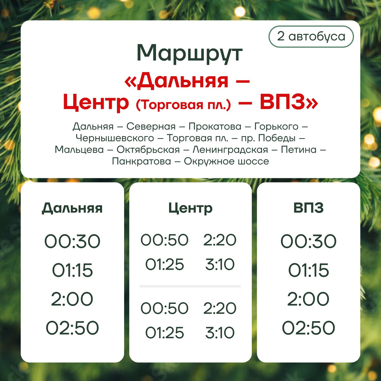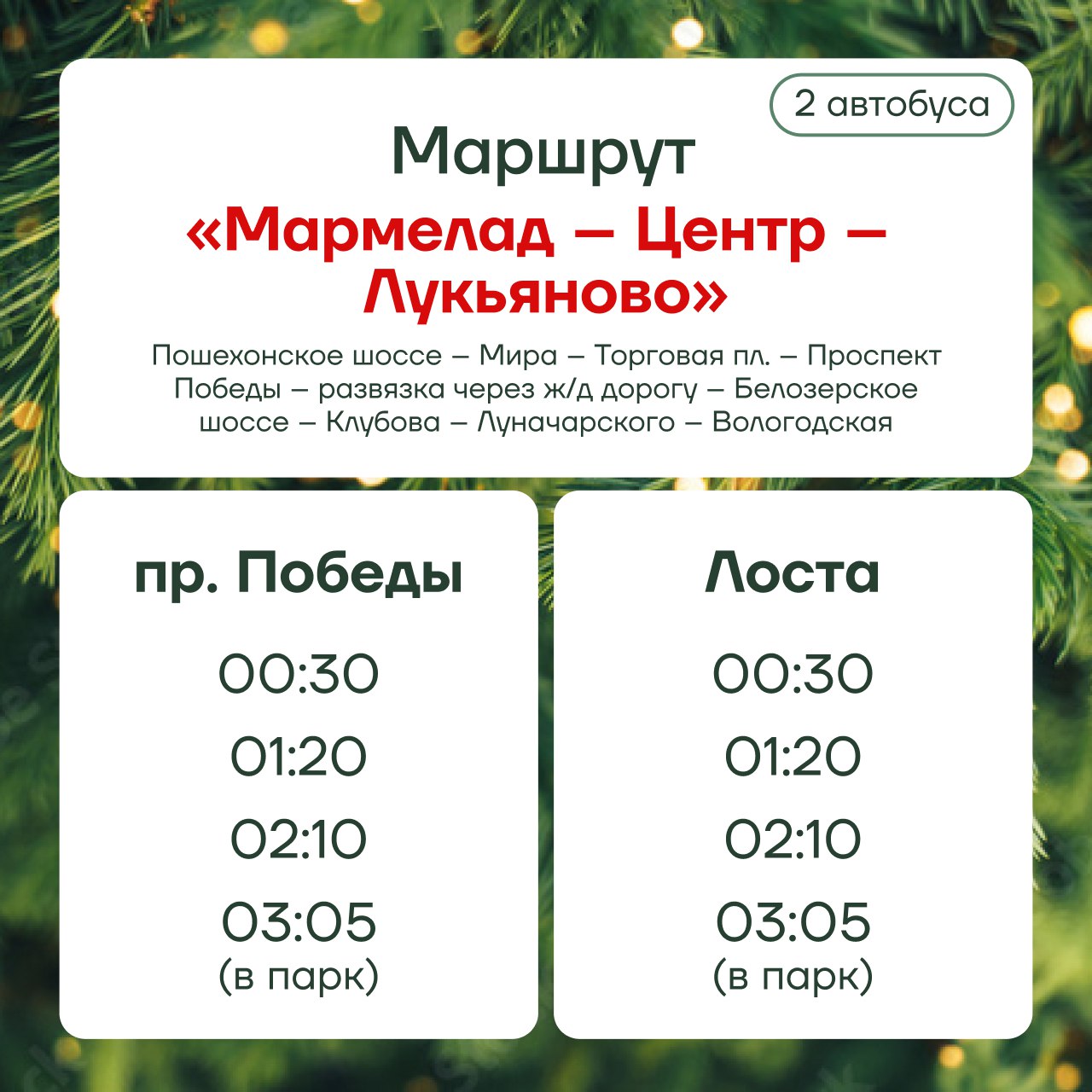 Чтобы жители разных районов города могли без проблем попасть на мероприятия и вернуться домой, с 00:30 до 03:00 1 января будет организовано бесплатное движение общественного транспорта. На пять маршрутов выйдут восемь автобусов, охватывающих ключевые микрорайоны Вологды.