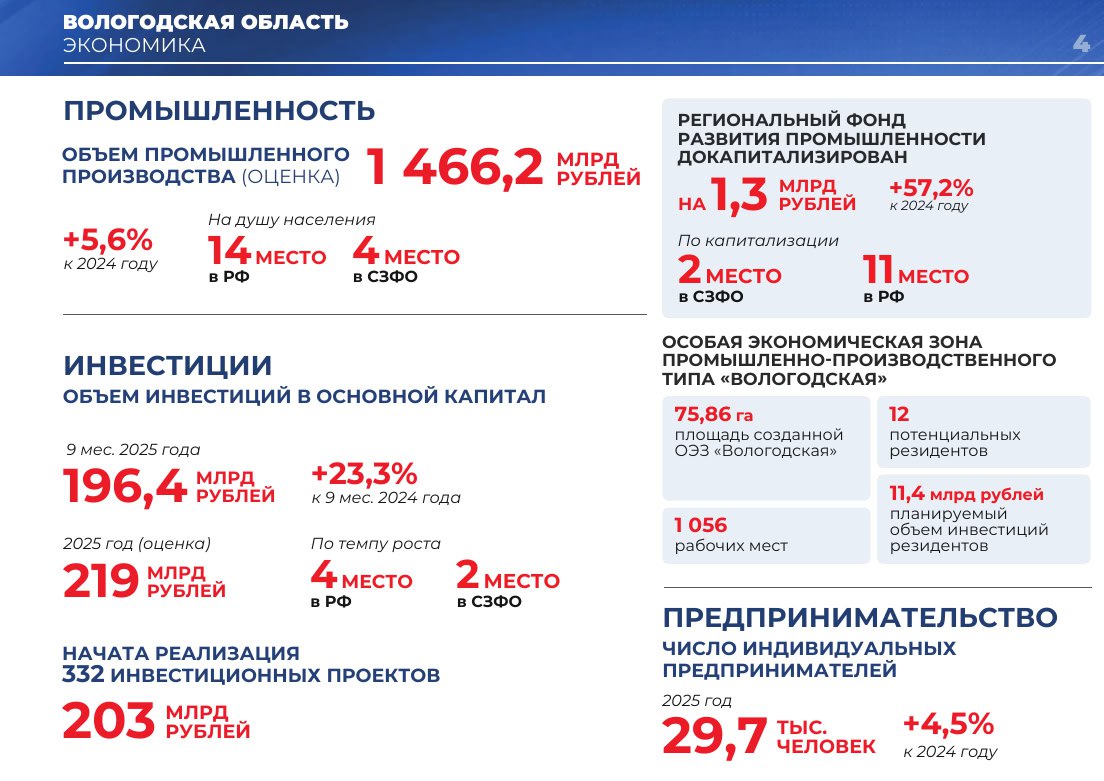 В 2025 году промышленное производство в Вологодской области составило 1 466,2 млрд рублей, что на 5,6% больше по сравнению с 2024 годом.