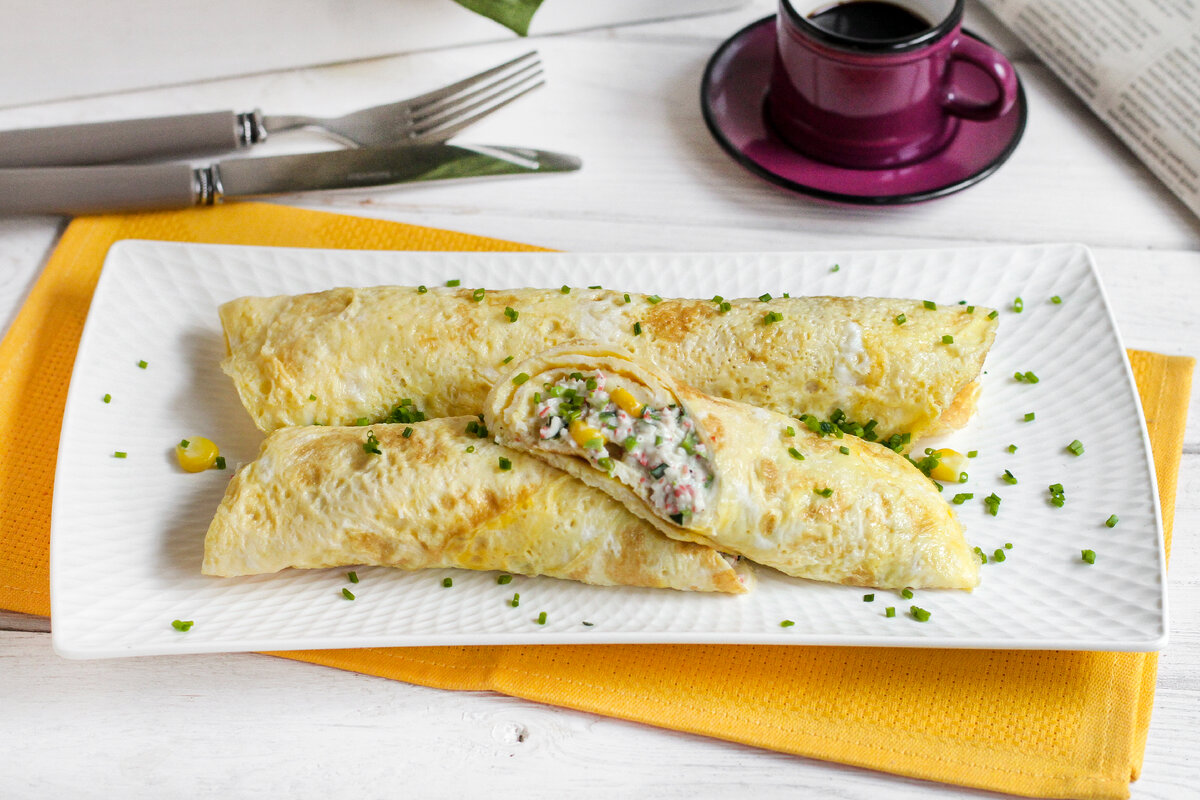 Готовую начинку выложить на омлет и аккуратно свернуть его в трубочку. Подавайте сразу — ваш кулинарный шедевр готов! Невероятное сочетание вкусов подарит незабываемые моменты за столом.