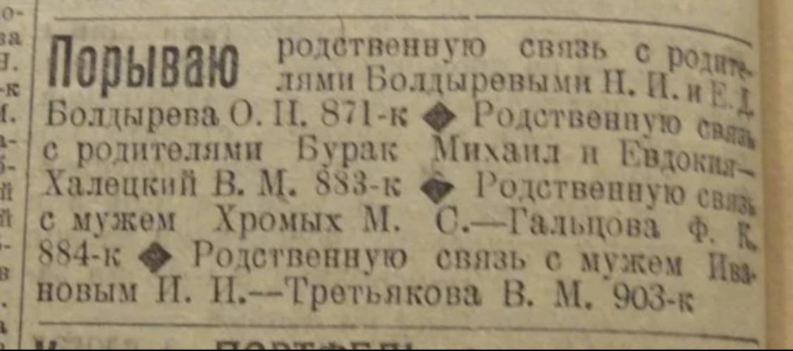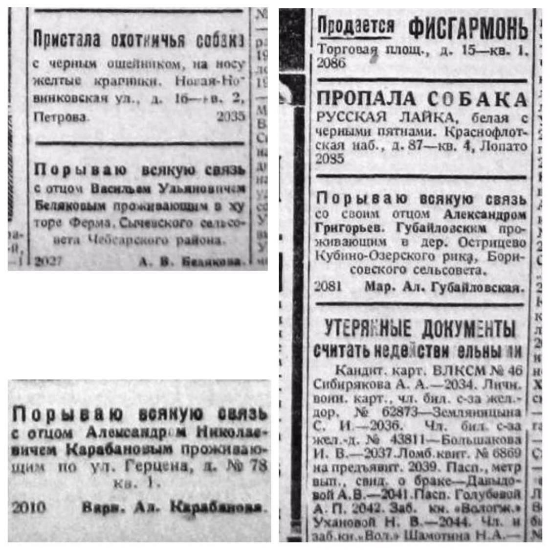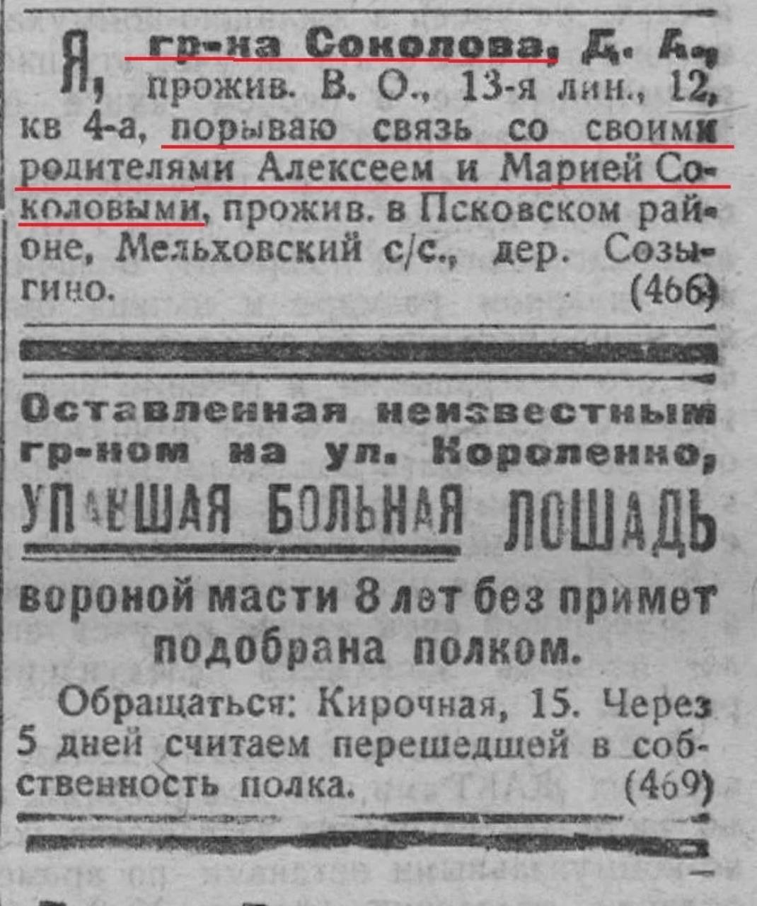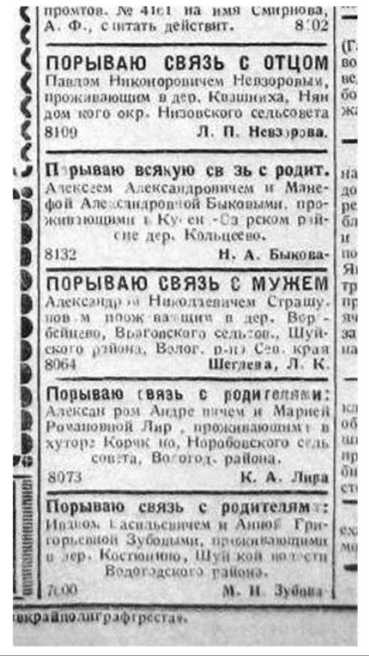 Чаще всего отрекались от родителей. Объявления о таком разрыве появлялись в газетах, как если бы это было обычным делом — рядом с объявлениями о пропавших животных или потерянных вещах. «Порываю связь с отцом, Иваном Власовичем Виноградовым, проживающим по Мал. Обуховской ул. Д. 3 кв 1. Викт. Ив. Виноградов».