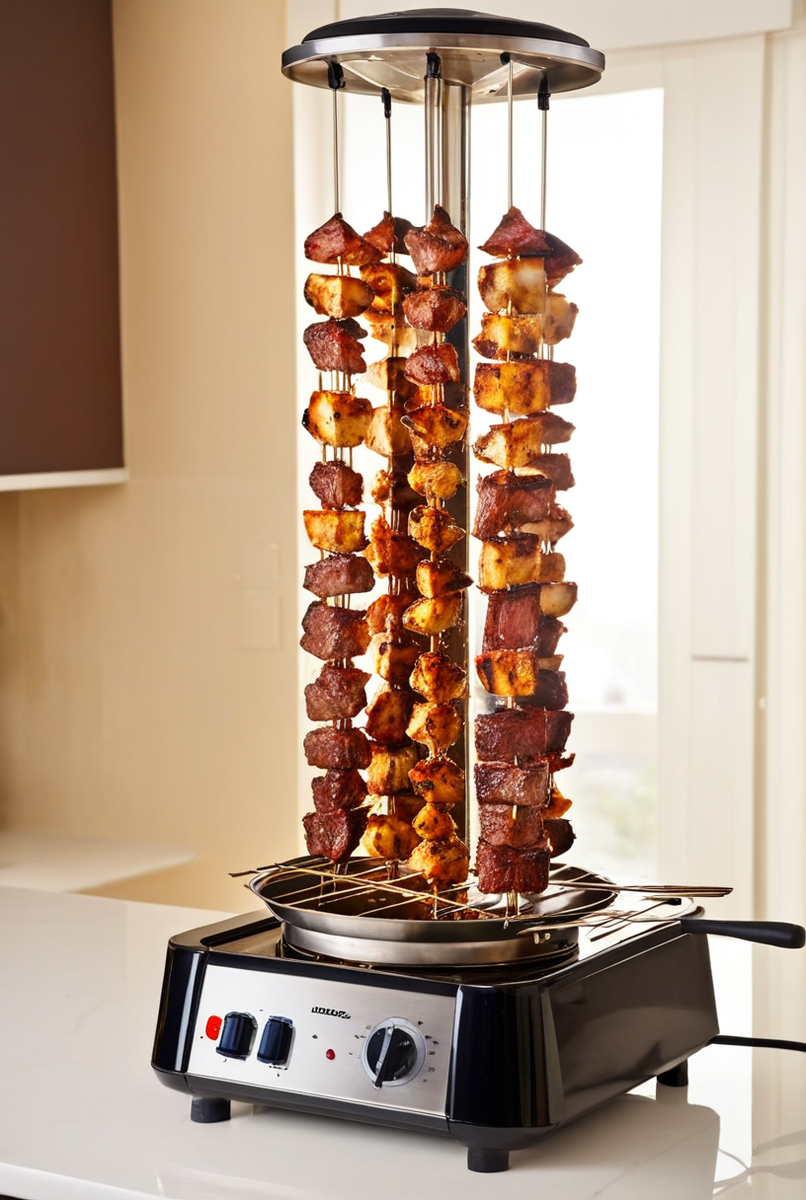 Электрическая шашлычница представляет собой вертикальный гриль, основанный на принципе использования нагревательного элемента (ТЭН), расположенного в центре девайса. Защитный стеклянный кожух обеспечивает безопасность и качество готовки. Шампуры, помещенные вокруг ТЭН, медленно вращаются, обеспечивая равномерное распределение жара.