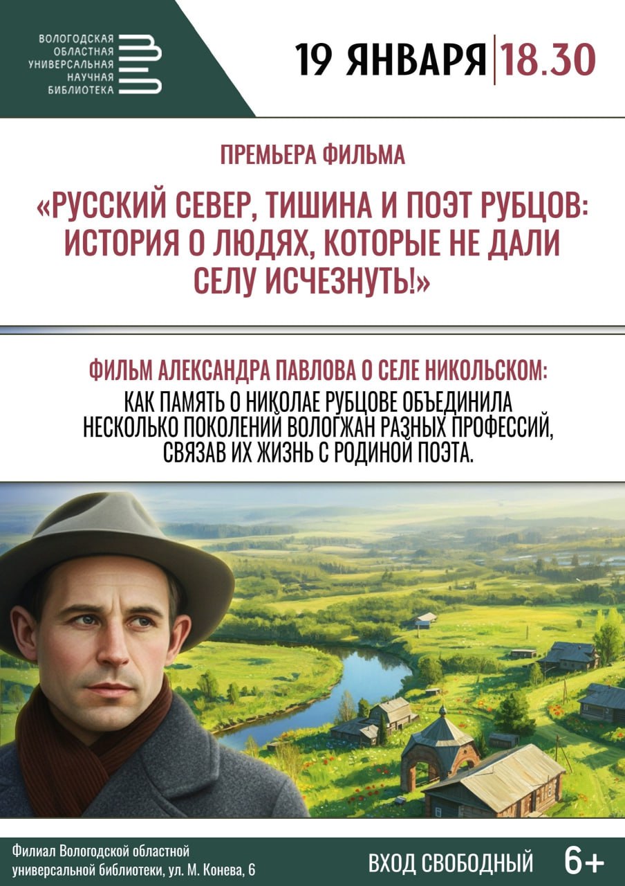 Премьера документального фильма вологодского режиссёра Александра Павлова «Русский Север, тишина и поэт Рубцов: история о людях, которые не дали селу исчезнуть» состоится в Вологодской областной библиотеке.