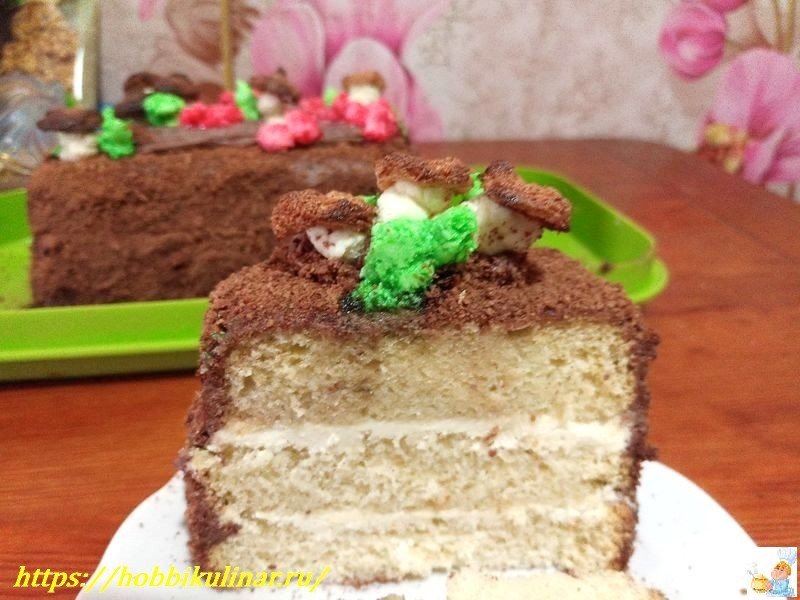 После охлаждения бисквита следует нарезать коржи, пропитать их подготовленным сиропом с коньяком, а затем прослоить кремом. Украсить можно по своему усмотрению: грибы на торте добавят ему особой атмосферы.