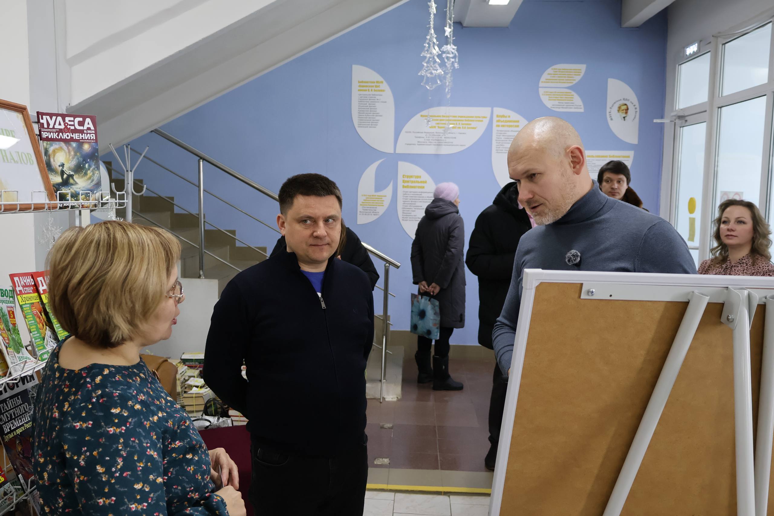 Посетили библиотеку имени Василия Ивановича Белова. В рамках национального проекта «Молодежь и дети» там уже завершен первый этап работ. Осмотрели как отремонтированные помещения, так и те, которые еще нуждаются в обновлении. На основе аналогичных проектов в других муниципалитетах дал рекомендации по дальнейшему ходу работ.