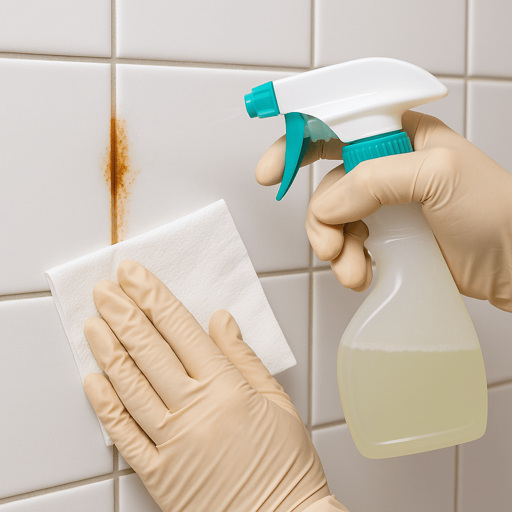Чаще всего металл в трубах, смесителях или держателях содержит железо. В воде капли попадают на кафель и швы, соединение с воздухом ускоряет оксидирование. Правильный подход — заменить агрессивные меры на деликатную химическую обработку, которая мягко снимает пятна без повреждений глазури.