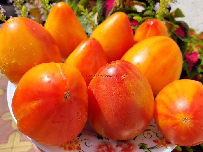 Плоды — крупные, весом от 200 до 500 граммов, сердцеобразной формы, с многоцветной окраской: оранжево-малиново-желтый фон, иногда с легким антоциановым оттенком. Мякоть мясистая и сладкая, с хорошей плотностью, что делает плоды удобными для нарезки и переработки. При правильном уходе они сохраняют форму и вкусовые качества в домашних заготовках.