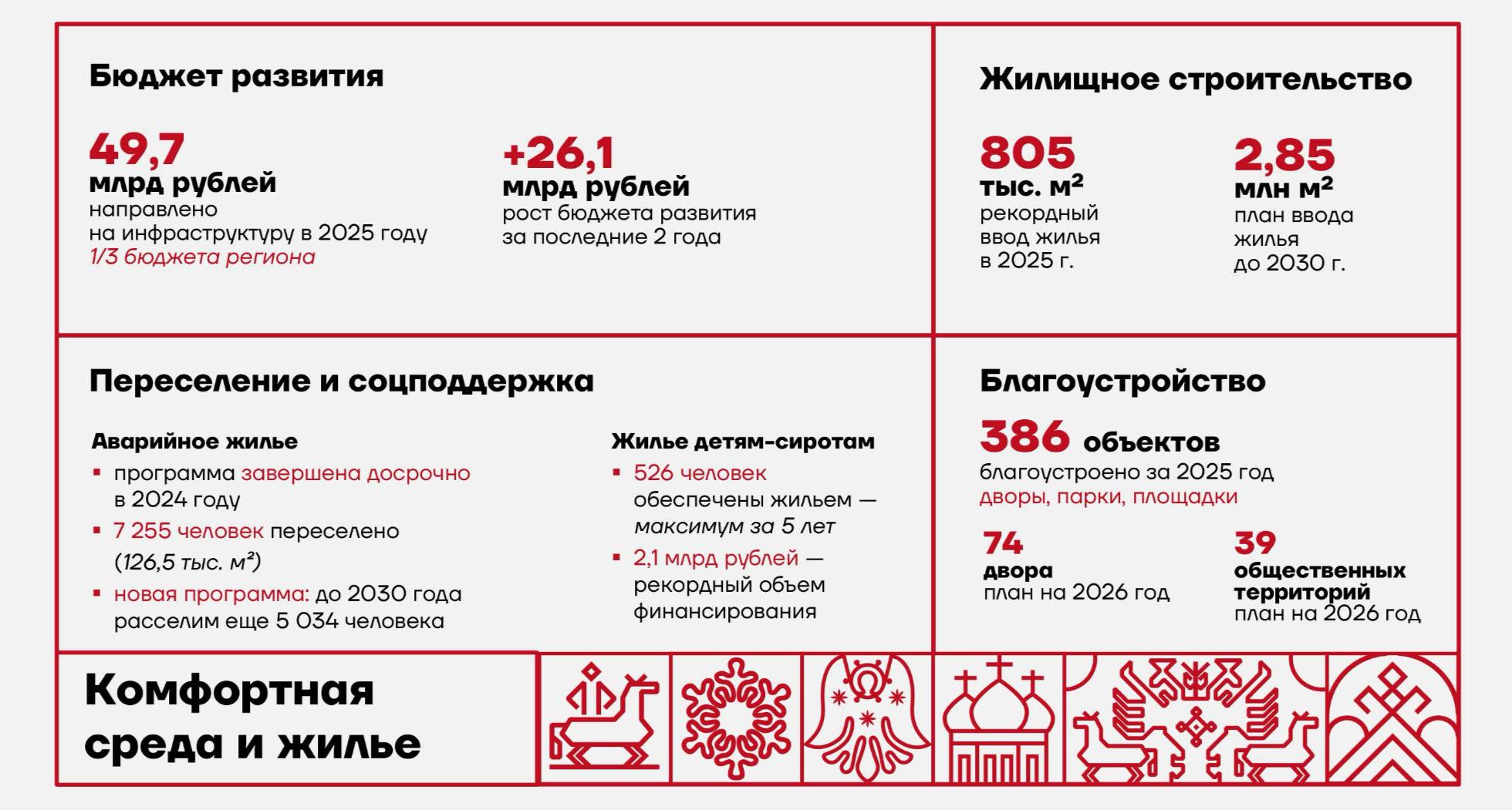 В центре внимания — народосбережение. Продолжаем строить регион, где хочется жить, учиться, работать и растить детей, чтобы молодежь оставалась здесь, на Вологодчине. Уже достигнуты впечатляющие результаты: в прошлом году в области введены рекордные 805 тысяч квадратных метров жилья, благоустроено 386 парков, скверов, бульваров, дворов и детских площадок.