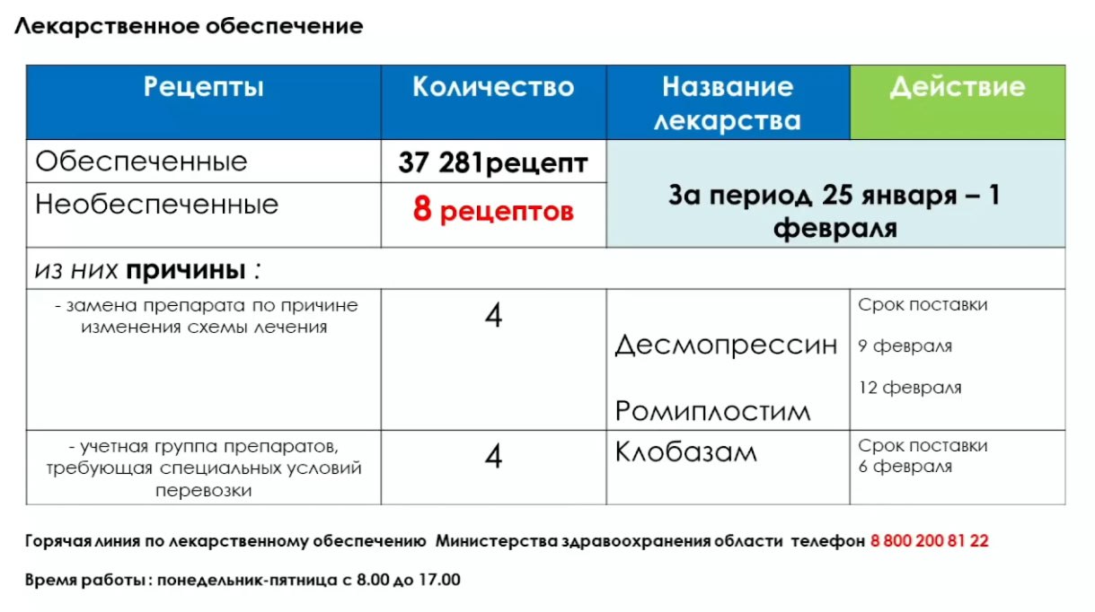 Горячая линия по лекарственному обеспечению минздрава области: 8 (800) 200-81-22.