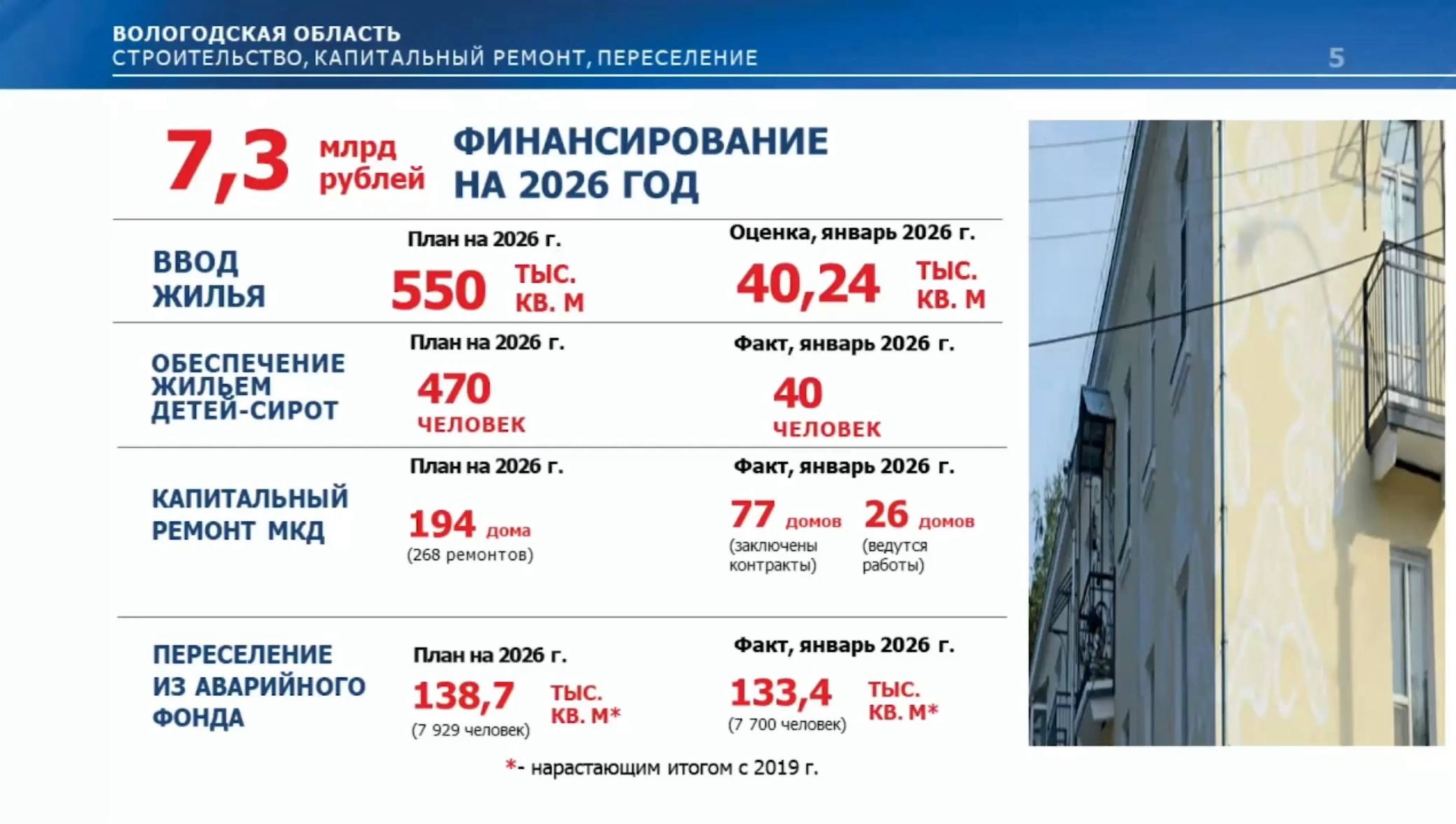 В рамках национального проекта Инфраструктура для жизни продолжается программа переселения из аварийного жилья. В январе общая площадь расселенных помещений составила 133,4 тысячи квадратных метров. Этот показатель с нарастающим эффектом с 2019 года.