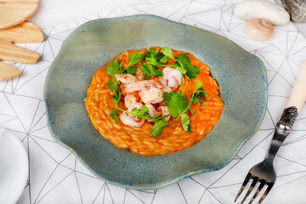 Шаг 3: Выложите орзо на тарелку, сверху разместите креветки и украсьте кинзой. Подавайте немедленно!