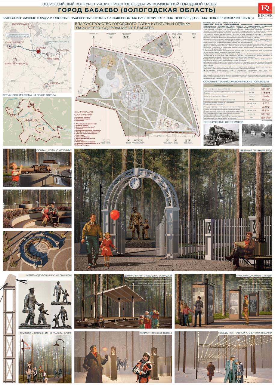 В Бабаево масштабное преображение ждет Парк железнодорожников, где планируется обновить эстраду, установить тематический фонтан, построить скейт-парк, новую детскую и спортивную площадку, а также павильоны в стиле исторических перронов.