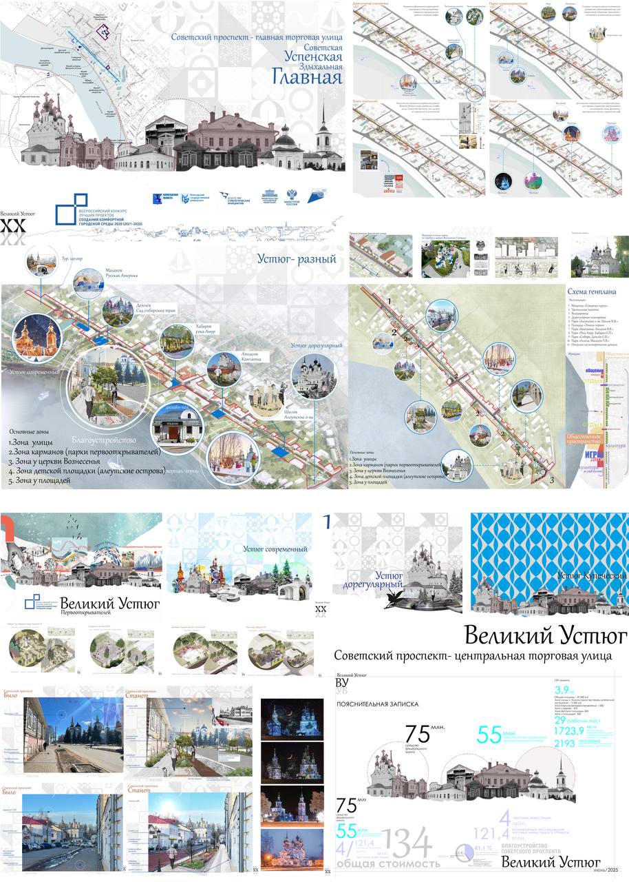 В Великом Устюге благоустроят Советский проспект главную торговую улицу. Концепция построена на идее ожившей летописи. Через современное благоустройство, навигацию и дизайн здесь будут раскрыты разные исторические этапы жизни города: от древности, через период расцвета купечества и эпоху первооткрывателей, до наших дней.