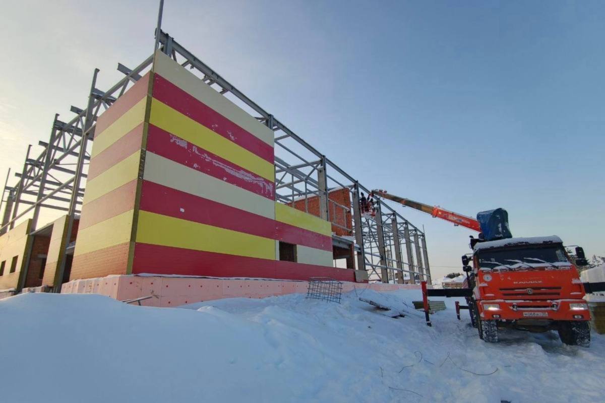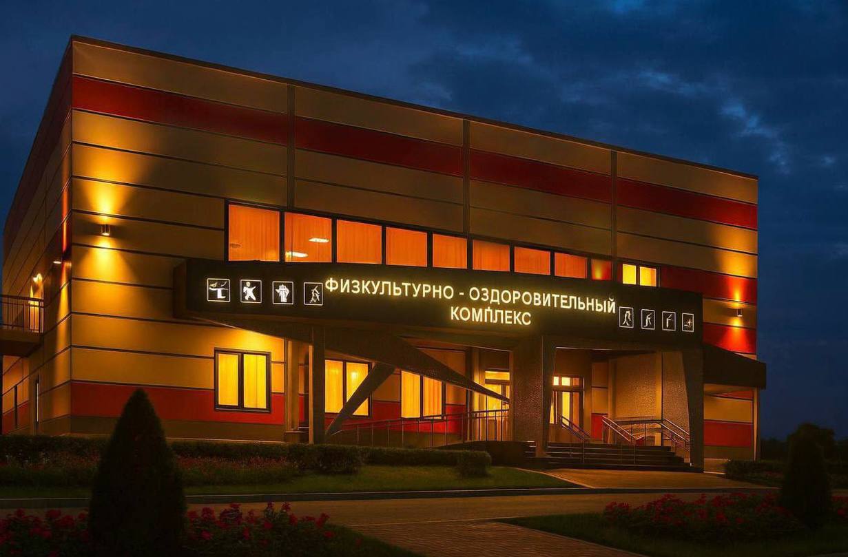 Этим летом в селе появится новый двухэтажный ФОК с тренажерным залом и залом для спортивных игр: волейбола и баскетбола. Работы ведутся в соответствии с графиком. Общий процент готовности сейчас 45%.