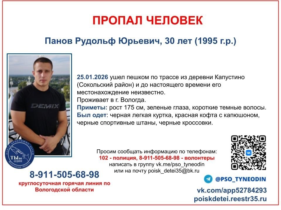По данным волонтёров, 25 января молодой человек ушёл по трассе из деревни Капустино Сокольского округа. С тех пор о судьбе 30-летнего мужчины ничего неизвестно.