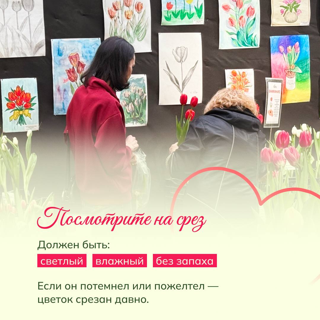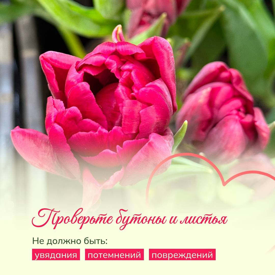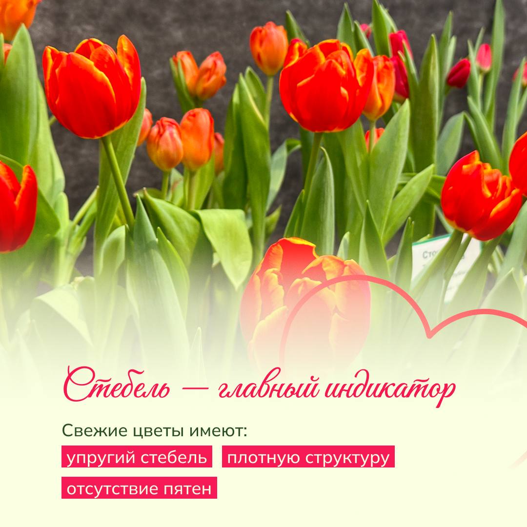 Тест для тюльпана: Отогните лепесток — он должен вернуться обратно. Слегка сожмите бутон снизу — свежий цветок слегка «поскрипывает».