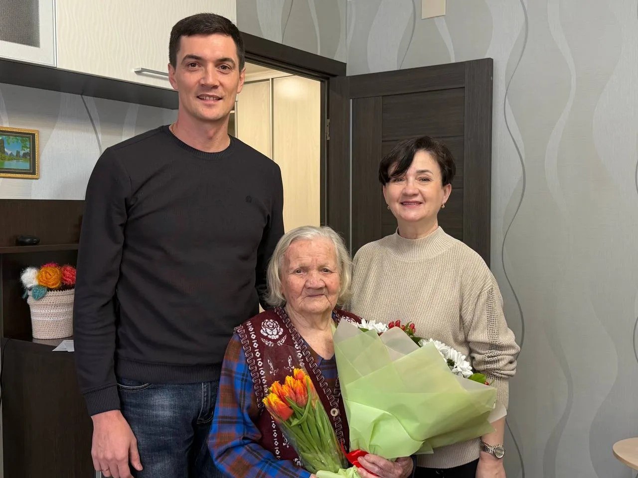 Елена Быкова вместе с сенатором РФ Романом Масловым поздравили череповчанку с 95-летием