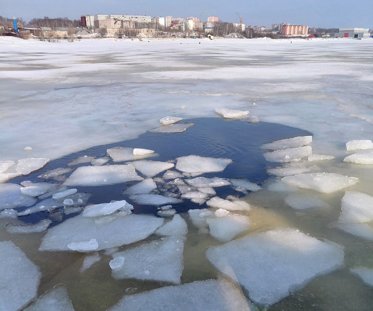 Как сообщает муниципальное учреждение "Спасательная служба", ежедневный мониторинг состояния льда показал, что за два дня толщина покрытия уменьшилась на 15 сантиметров. Прогнозируемые плюсовые температуры приведут к дальнейшему его таянию. А в районе старой зимней дороги уже образовалась промоина.