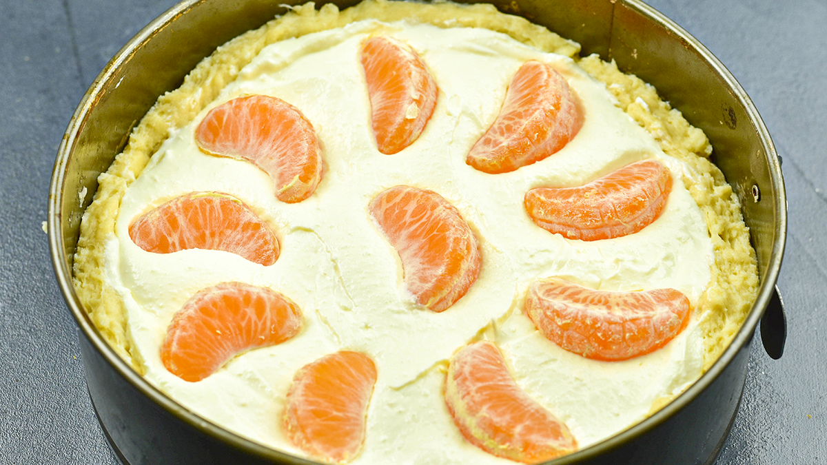8. Равномерно распределите творожную начинку на тесте, а затем аккуратно уложите дольки мандарина сверху.