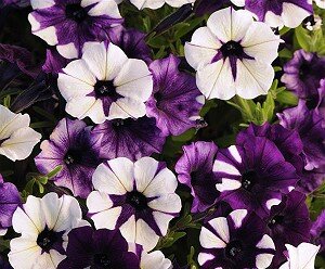 - Петуния Shock Wave Purple Tie Dye 2020: Эта диковинка выделяется двухцветными лепестками, сочетая фиолетовый и белый цвета в уникальных узорах. Сорт относится к мощной серии Shock Wave, что гарантирует пышное цветение и обилие цветов.