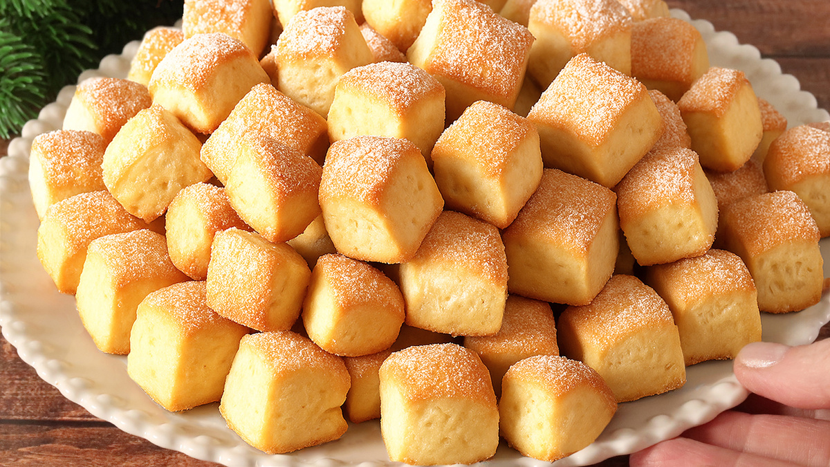 Далее в тесто вводят муку в комбинации с разрыхлителем. Консистенция должна быть легкой и воздушной. После этого тесто раскатывается, посыпается сахаром и нарезается на небольшие квадратики. Эти кусочки отправляются в разогретую до 180°C духовку.