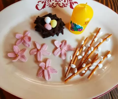 Перейдем к следующему украшению — шоколадному гнёздышку. Для его создания шоколад необходимо поломать и растопить в микроволновой печи. Периодически перемешивайте, пока не образуется однородная масса. Подготовьте соломку, ломая её на небольшие кусочки, и окунайте в растопленный шоколад. Затем выложите на дощечку, обёрнутую пленкой, формируя гнёздышко с бортиками. После того, как шоколад застынет, можно дополнить гнёздышко перепелиными или декоративными яйцами.