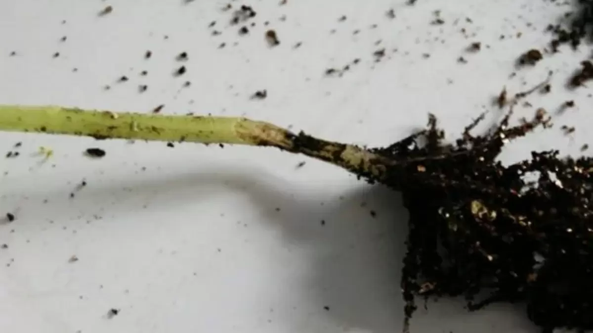 Стебель у основания (корневая шейка) становится тонким и чернеет, растение падет, как подкошенное, а корни могут выглядеть нормально.
