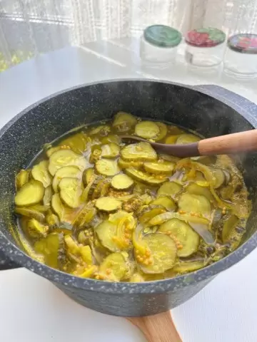 Тем временем в кастрюлю добавляются все составные части маринада, включая сок, выделившийся от огурцов. Смесь доводится до кипения. Как только начнет бурлить, в кастрюлю засыпаются огурцы и лук, и варим все вместе в течение пяти минут.
