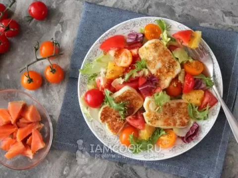 А затем в небольшой миске смешайте оливковое масло, апельсиновый сок, горчицу, мёд и щепотку соли. Взбейте все ингредиенты до однородного состояния. Теперь время собирать салат — уложите заранее промытые листья салата на тарелку, добавьте нарезанные помидоры разного цвета и кусочки апельсина. Завершите композицию обжаренным халуми и полейте заправкой.