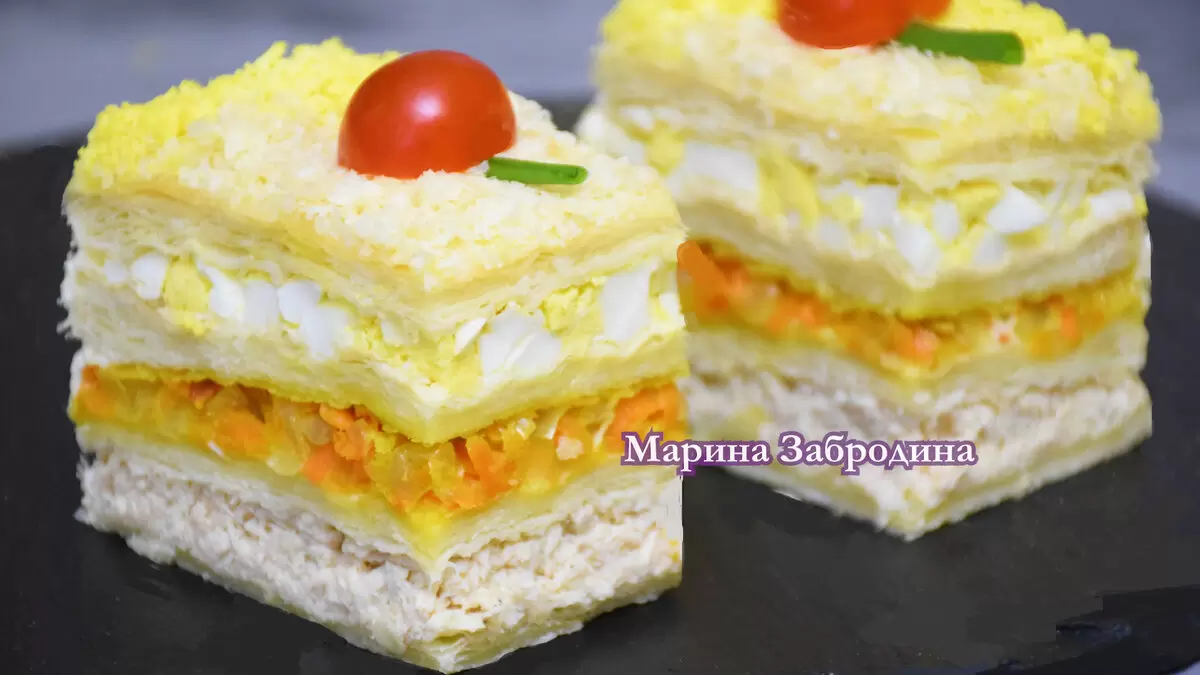 Закусочный торт «Наполеон» — это не просто вкусное угощение, но и настоящее украшение любого стола. Его можно готовить из обычных ингредиентов, а результат обязательно порадует гостей. Каждый корж можно разрезать пополам, чтобы начинка лучше пропиталась, и можно проявить фантазию, выбрав любые ингредиенты для начинки. Например, курицу можно заменить на консервированную рыбу — получится очень вкусно!