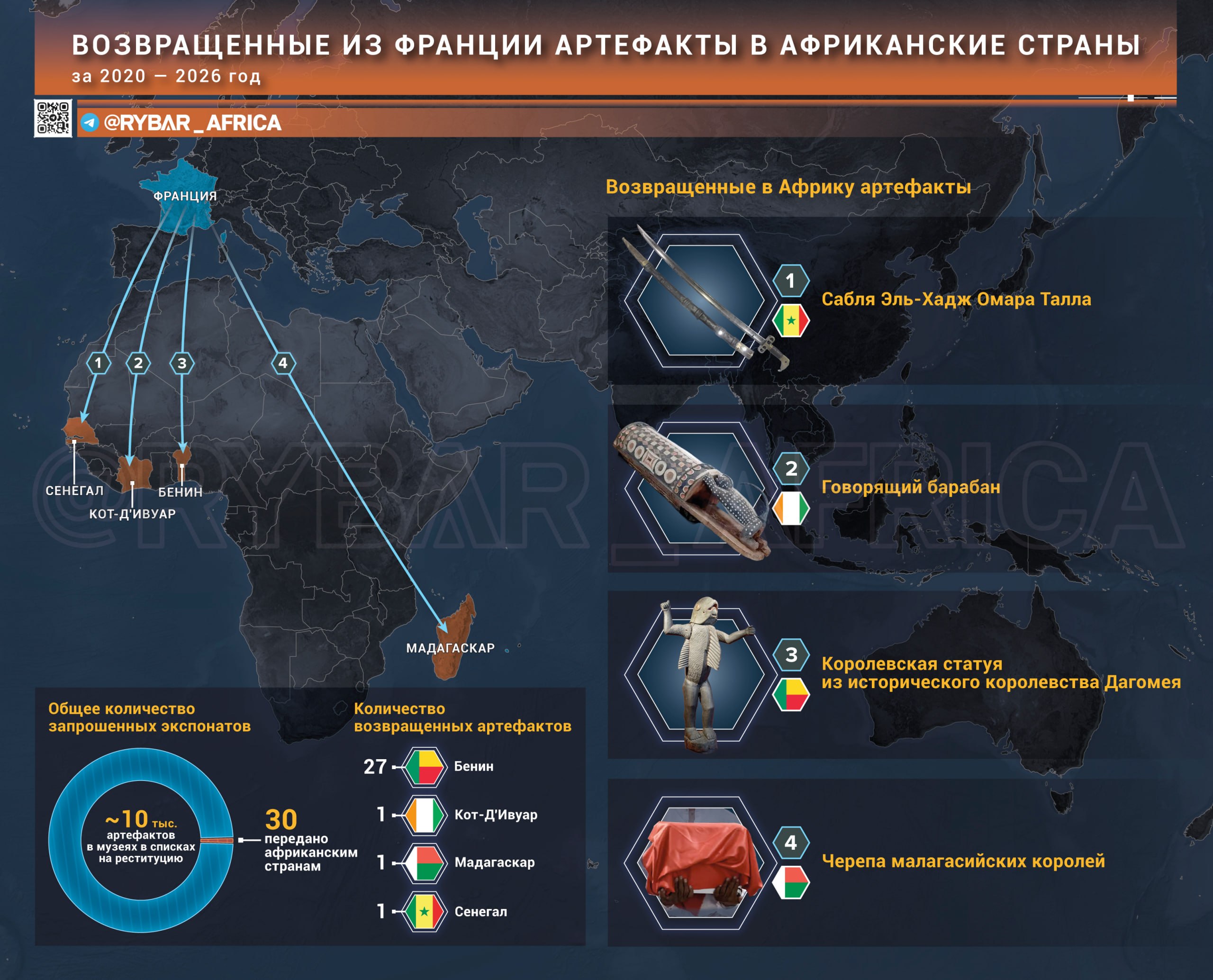 Главные кейсы реституции:Самый массовый возврат — 26 сокровищ королевства Дагомея (включая трон короля Гле-Гле) в Бенин. Это была разовая акция, потребовавшая отдельного закона. В рамках него же возвращена сабля (сабр) Эль-Хадж Омара Талла.