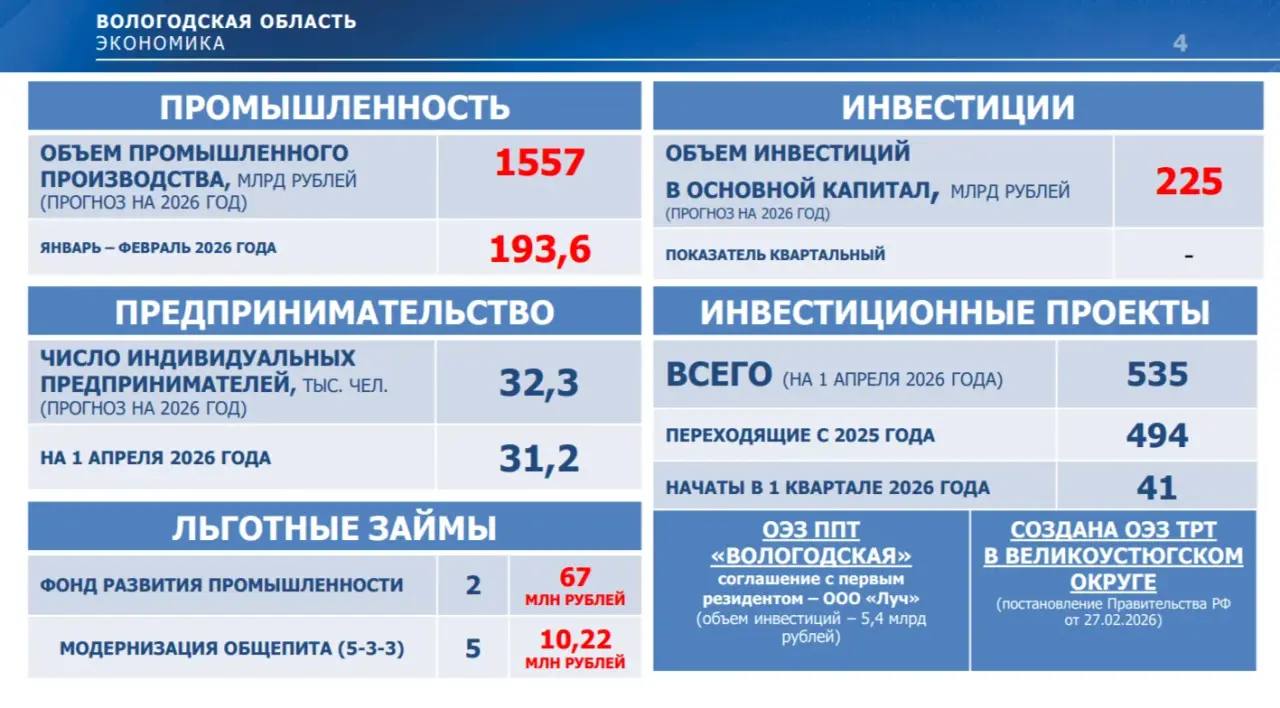 Объем промышленного производства в Вологодской области составил 1,557 трлн рублей, а инвестиции в основной капитал достигли 225 млрд рублей.