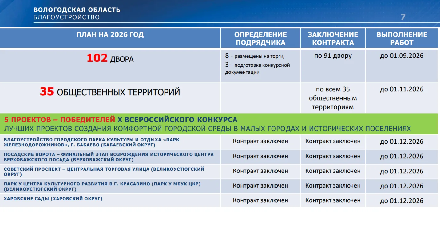 102 двора и 35 общественных пространств благоустроят в регионе в 2026 году. Контракты по 91 двору и всем 35 территориям уже подписаны.