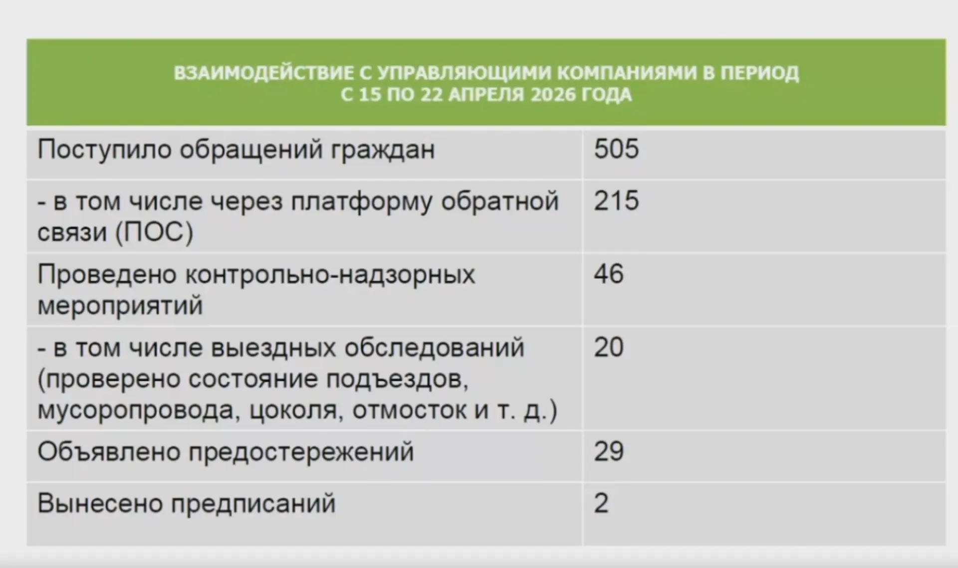 За это время поступило 505 обращений граждан, из которых 215 — через платформу обратной связи (ПОС).Проведено 46 контрольных и надзорных мероприятий, включая 20 выездных обследований состояния подъездов, мусоропровода, цоколей, отмосток и...