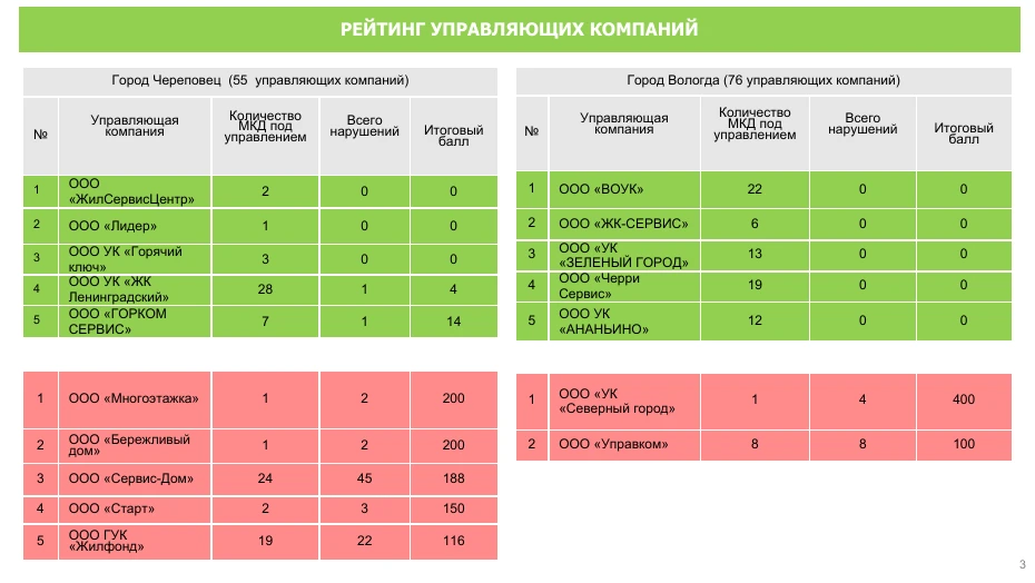 В рейтинге управляющих компаний Вологды и Череповца лидируют: