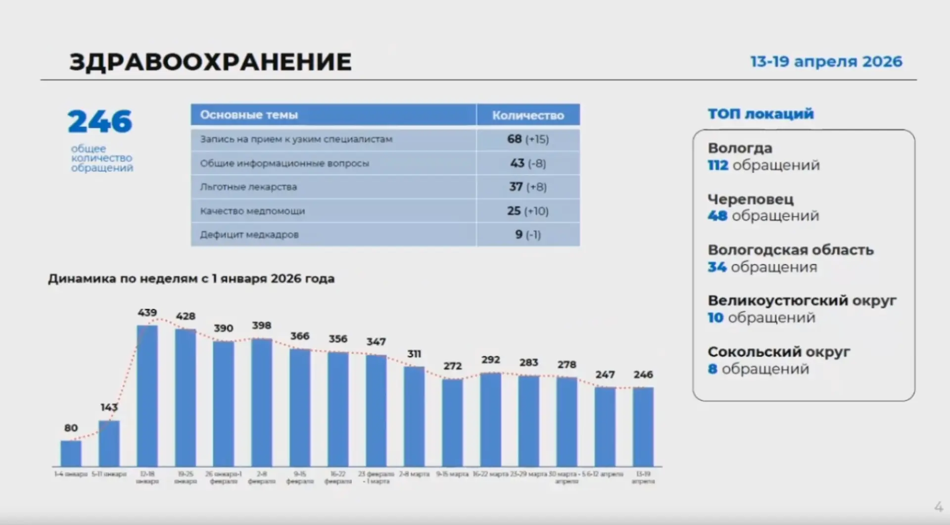 Здравоохранение за неделю: 246 обращений. Главное, что волнует жителей — запись к узким специалистам (68), льготные лекарства (37) и качество медпомощи (25).