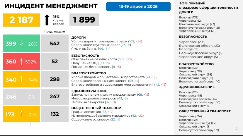 Общее количество обращений составило 2 187, что на 15% больше, чем на прошлой неделе. Основные темы:
