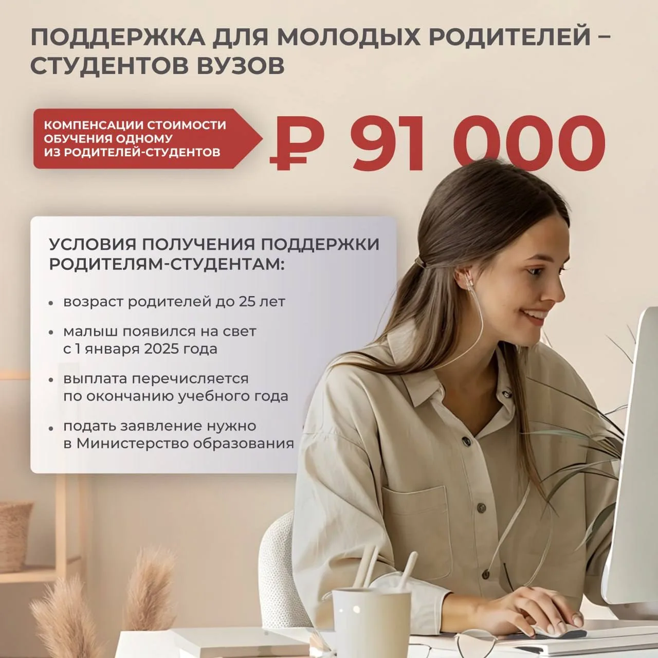 до 91 тыс. руб. компенсации стоимости обучения в вузе одному из родителей-студентов;
