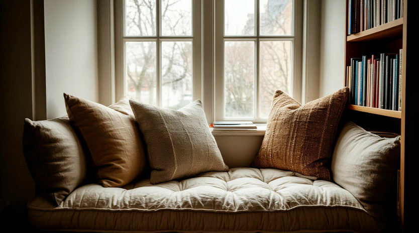 Чтобы организовать уютный уголок, необходимо внимательно осмотреть квартиру на предмет свободных мест. Да, подоконник может отличаться от обычного элемента интерьера: добавив мягкий матрас и несколько подушек, его можно превратить в приятное местечко для чтения. Заодно и угол комнаты, заполненный ненужными предметами, может стать вашим личным пространством, пусть даже с забытым книжным стеллажом.