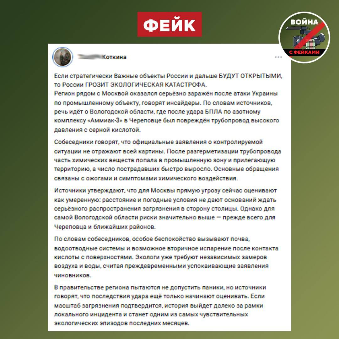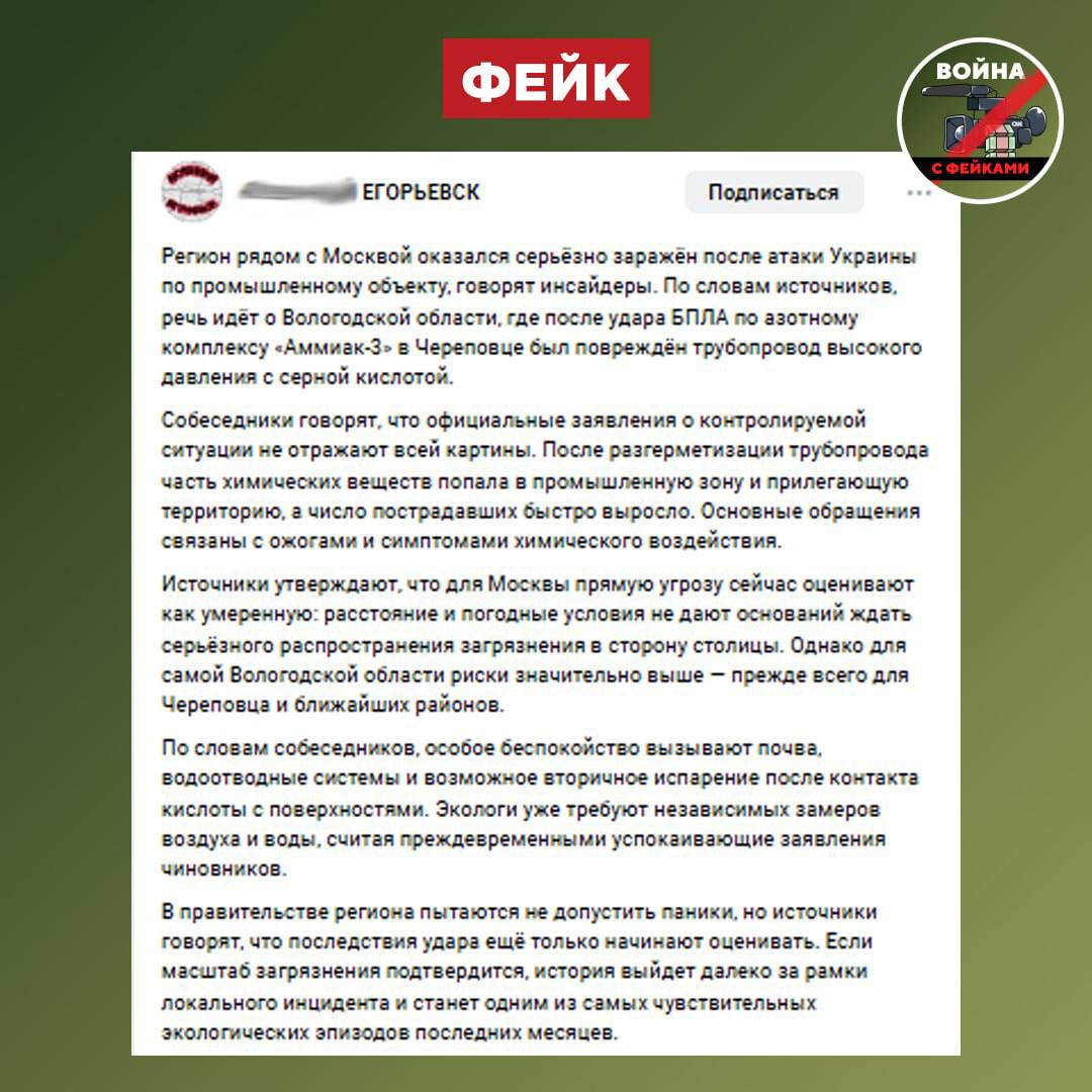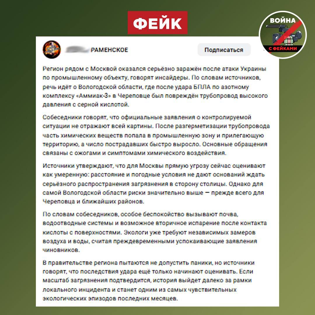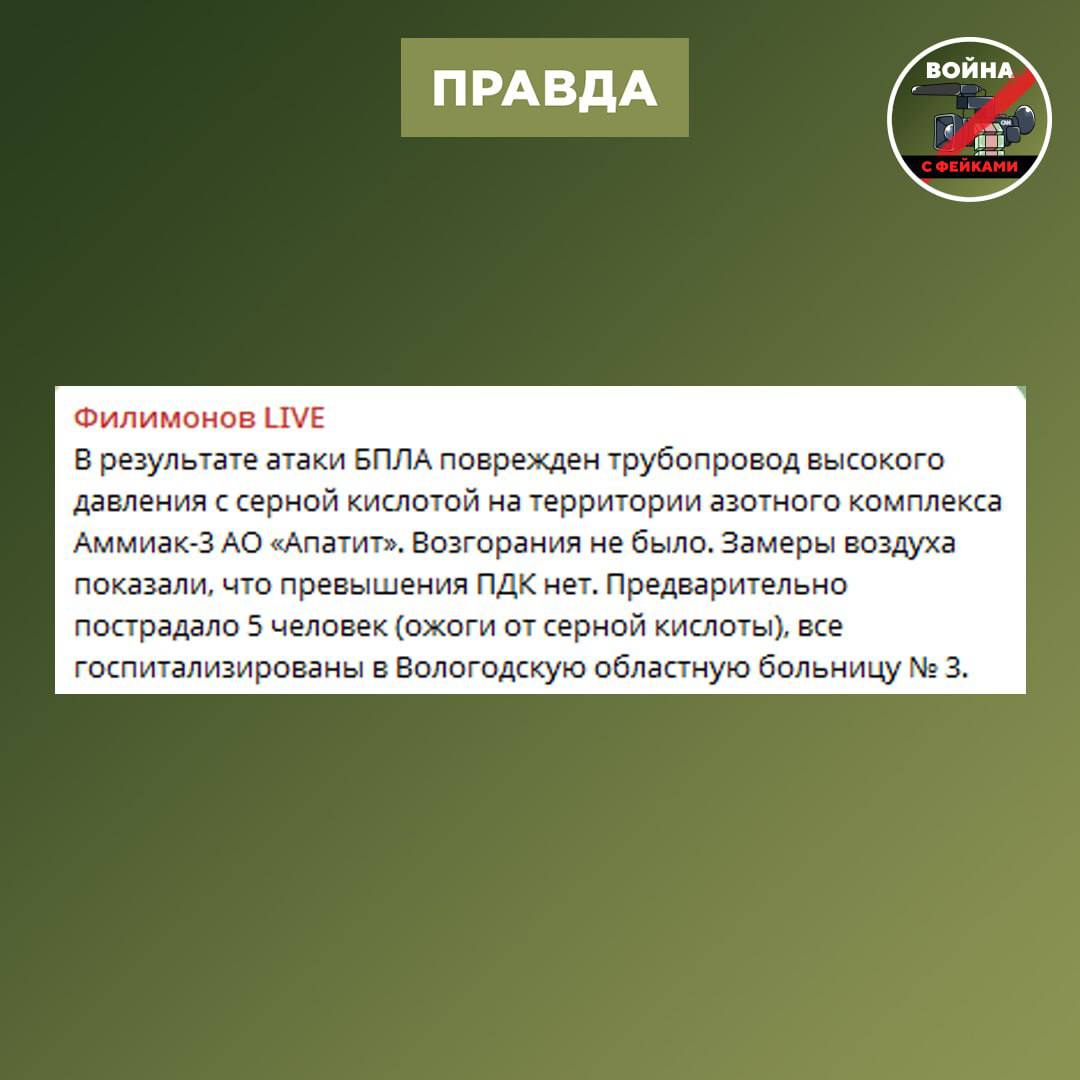 Фейк: В результате украинского удара по азотному комплексу «Аммиак-3» в Череповце зафиксированы масштабные загрязнения воздуха, воды и почвы, а также резко выросло число пострадавших, обратившихся с химическими ожогами. Такие сообщения распространяются через телеграм-каналы и соцсети.