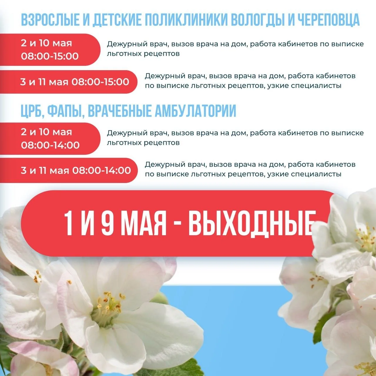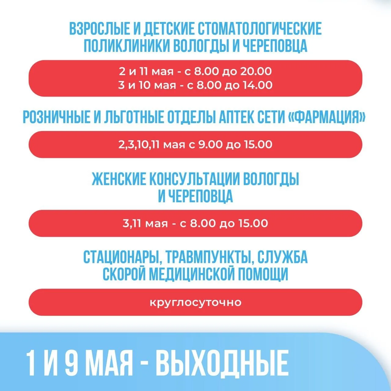 Для оказания помощи вологжанам в праздничные дни Министерством здравоохранения области определен следующий график работы медицинских организаций В круглосуточном режиме работают стационары, травмпункты, служба скорой медицинской помощи.