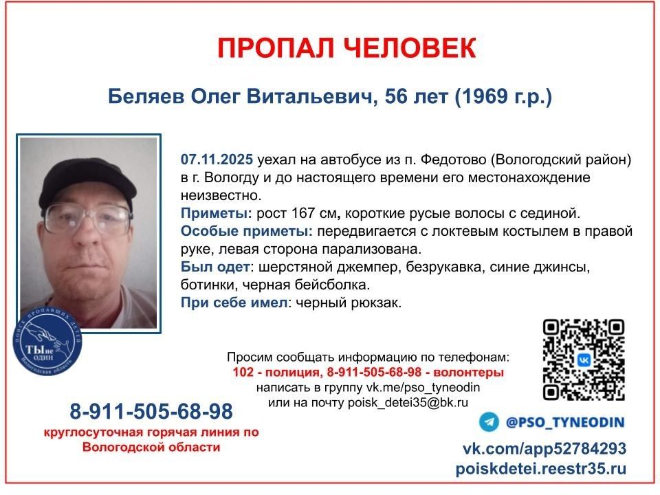 О судьбе 56-летнего вологжанина ничего неизвестно уже две недели.Ориентировку распространил ПСО «Ты не один». По данным волонтёров, Олег Витальевич Беляев уехал из посёлка Федотово в Вологду на автобусе 7 ноября. С тех пор сведений о его...